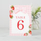 Numéros de table à la fraise Coquette. Caractérisés par un thème de fraise ravissant, une écriture rouge élégante et des accents d'aquarelle douce, ce design est parfait pour une célébration de baby shower de printemps ou d'été.