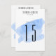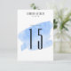 Une caractéristique moderne des numéros de table de mariage avec un fond à lavis d'aquarelle bleue.