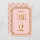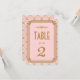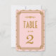 Ces numéros de table présentent une palette de couleurs rose et or, un cadre géométrique, des motifs géométriques et d'autres détails stylistiques, tous inspirés de l'Art déco et des années folles. Vous pouvez personnaliser les champs de texte d'exemple à votre goût.