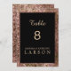 Un élégant numéro de table de mariage moderne en or rose pailleté et noir. Les numéros de table font partie d'un ensemble complet d'invitations de mariage.