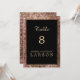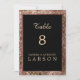 Un élégant numéro de table de mariage moderne en or rose pailleté et noir. Les numéros de table font partie d'un ensemble complet d'invitations de mariage.