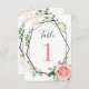 Nombres de table géométriques rose or moderne. Cette invitation avec feuillage vert fera l'affaire ! Cette invitation personnalisable présente un cadre géométrique moderne avec paillettes dorées et noires. Les bordures sont ornées de feuillage vert comme l'eucalyptus, les baies et les fleurs de roses roses et crème. Les côtés sont ornés de paillettes dorées. Cela fait une excellente invitation de feuillage moderne.