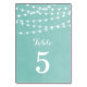 Design chic moderne de carte de numéro de table mariage d'été avec des lampes à cordes élégantes et simples accrochées sur le dessus et un mélange classe de polices de script modernes et de calligraphie sur un arrière - plan imprimé fausse aquarelle texture. Un design simple et élégant, parfait pour l'été ! Cliquez sur le bouton CUSTOMISER IT pour customiser les polices, déplacer du texte et créer votre propre conception unique d'invitation unique.