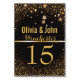 Cartes de numéro de table de mariage de parties scintillant noir et or étoilé pour votre décoration de mariage personnalisée. Arrière - plan noir mat au charbon de bois avec parties scintillant fausse feuille d'or en haut et en bas avec étoiles d'argent et d'or éparpillé sur le dessus. Une bande de look métallique or sépare les noms de mariée et de mariée personnalisées de couleur or et le nom de famille dans un script élégant d'un numéro de table jumbo or teinte or. Identique de l'autre côté. Customisez individuellement et ajoutez chaque carte de numéro de table mariage séparément à votre panier Zazzle. Idéal pour les élégants mariages de parties scintillant noir et or, ainsi que les thèmes mariages d'inspiration Art Déco de Great Gatsby. Convient à d'autres occasions spéciales, telles que des fêtes de fiançailles, des wedding showers, etc.