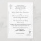 Design front features a pure white background to the elegant image of a silver crucifix at top left corner. Bottom right corner displays the image of the Holy Eucharist suspended above chalice with the image joined wedding rings displayed beside it. Following the traditional format for a Catholic wedding invitation, text is featured in an elegant silver-colored print. The names of bride and groom, along with event are displayed in a graceful Nuptial font. Design is accented by an elegant flourish aligning the left and right sides