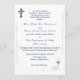 Design front features a pure white background to the elegant image of a silver crucifix at top left corner. Bottom right corner displays the image of the Holy Eucharist suspended above chalice with the image joined wedding rings displayed beside it. Following the traditional format for a Catholic wedding invitation, text is featured in an elegant blue font. The names of bride and groom, along with event are displayed in a graceful Nuptial font. Design is accented by an elegant flourish aligning the left and right sides