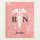 Nurse RN Caduceus Pink Personnalisé Name Planner est un design moderne et élégant avec un arrière - plan rose doré rose et blanc moucheté et un symbole médical blanc sur le centre. Le texte est "RN" et votre nom est personnalisé avec en écriture de script tendance. Idéal pour les infirmières autorisées et les étudiants en sciences infirmières.