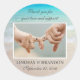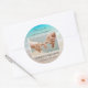 Mariage de plage, photo en faveur des étiquettes, dans un thème tropical. Eau de mer et sable de plage est l'image arrière - plan sur cet autocollant rond. Ajoutez une photo du couple en horizontale, aménagé en paysage, et customisez avec un message de remerciement aux invités mariages. Les noms de la mariée, du marié et de la date du mariage seront en bas.