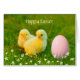 Carte de Pâques avec œuf de Pâques et poussins et fleurs. Le texte peut être personnalisé pour Pâques ou un anniversaire.