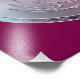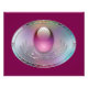 Un décor bleu pastel, lavande et rose avec un oeuf rose translucide dans un cadre argenté, entouré d'un cadre ovale argenté clair et composé de quatre pierres précieuses plus lisses comme des oeufs colorés.