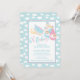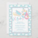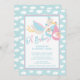 Amusement moderne Oh babies invitation douche avec une adorable cigogne avec un paquet de 2 bébés en rose & bleu ensemble sur un arrière - plan bleu avec nuages blancs pour un baby shower garçon et fille jumeaux.