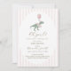 Welcome your baby girl with this sweet dinosaur baby shower invitation featuring a watercolor green T-rex wearing a pink bow and holding a pink balloon. The pink and black striped background adds a stylish yet playful touch. Ideal for dino-loving parents and “a little girl is hatching soon” themes. Fully customizable to match your event details and perfect for a chic prehistoric celebration.