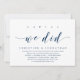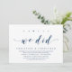 Thème élégant de couleur bleu marine dans un style moderne, carte d'invitation de mariage en fuite (Oh Oui, Nous L'avons Fait). C'est parfait pour votre célébration décontractée de mariage en fuite au bord d'un lac.