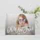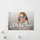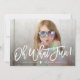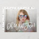 Carte de vacances moderne avec les mots "oh quel plaisir!" dans un texte blanc, écrit à la main brossé avec votre photo affichée derrière. La superposition blanche, le coeur et le texte peuvent être positionnés n'importe où sur la carte. Sur le dos est présenté un motif étoilé argenté sur blanc.