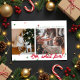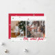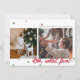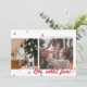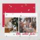 Carte de vœux de vacances plate moderne et minimaliste avec deux emplacements de photos décalés et des confettis de couleur de Noël (nuances de rouge et de vert) dispersés en haut et en bas. La phrase "OH, quelle joie !" est affichée en gras en bas à gauche. Le coin supérieur droit comporte une zone de texte modifiable pour votre propre message de vacances, nom et année. Le devant de la carte a un fond blanc. Le dos de la carte a un fond rouge avec des confettis supplémentaires dispersés.