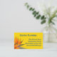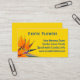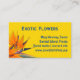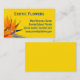 Des cartes de visite fleuris et lumineux aux fleurs d'oiseaux de paradis. Cartes jaunes avec des fleurs exotiques oranges dans le coin. Customisez un texte bleu foncé à deux endroits pour faire de la publicité pour une entreprise ou une profession. Titre ou nom commercial en haut avec jusqu'à cinq lignes de texte imprimé qui est aligné à droite. L'inverse est jaune solide.