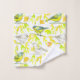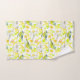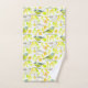 Un ensemble de serviettes à thème pour oiseaux avec un motif d'oiseaux et de feuilles illustrés d'encre et d'aquarelle accentuée d'un joyeux jaune solide sur la serviette de bain.