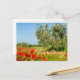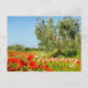 Carte postale d'un vieil olivier dans un champ de pavot rempli de pavots rouges vibrants dans un paysage en Toscane, Italie avec le texte : 'Toscane'.