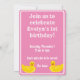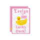 One lucky duck first birthday invitation. Includes original art from artist, KG Nowak. An adorable yellow rubber duck greets your guests. Pink lettering and bubbles included on the front of the card.