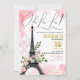 Belle invitation d'anniversaire avec un thème parisien qui comprend un arrière - plan d'aquarelle rose à la fleur de lis et la Tour Eiffel habillée d'un arc rose aux fleurs de cerises et d'une branche en feuilles vertes. Le texte du support de la police de caractères noir, rose et or est facilement mis à jour avec vos détails. "Ooh La La !" en gras texte en haut ajoute à l'excitation.