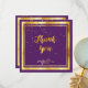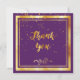 Un fond de couleur violette et un cadre en faux or. Avec une pluie de confettis dorés. Sur le devant, un script de style lettrage manuel et le texte : Merci ! et un décor floral en faux or.