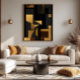 Cette oeuvre abstraite est un dialogue entre le luxe de l'or et la profondeur de l'ombre. Des géométries précises (rectangles, triangles, courbes) s'entrelacent comme des notes musicales, créant un rythme visuel qui invitation l'oeil pour explorer chaque couche. Les teintes dorées rayonnent de sophistication, tandis que les noirs intenses ajoutent du drame, ce qui donne un morceau qui équilibre modernité et intemporalité. Idéal pour des espaces à la recherche d'élégance sans sacrifier la personnalité.