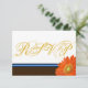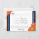 Elégante marguerite orange avec un arrière - plan marron et blanc avec une bande de preppy bleu et noir sophistiquée. Le script est dans une élégante couleur jaune or. La papeterie mariage de coordination est disponible à Rizziez Mariage Place.