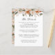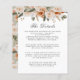 Cette élégante carte d'information sur les invités à l'aquarelle verte, ivoire, orange et vert mousse présente une bordure botanique de fleurs délicates sur le dessus de votre texte souhaité. Parfait pour conseiller les clients sur les chambres d'hôtel, les codes de groupe, les transports, les directions, les informations de bienvenue de réception, et votre URL de site mariage. Indiqué pour une célébration mariage sophistiquée ou chic à n'importe quel moment de l'année. Carte inversée à un motif de fleurs assorti dans la même palette de couleurs de terre sur un arrière - plan vert sauge clair