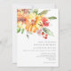 Une belle faire-part de mariage parfaite pour la chute, avec un arrangement de fleurs d'aquarelle orange et de feuilles. Le texte personnalisé est en police grise serif.