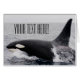 The Orca Killer Whale Breach Surface Custom Text Greeting Card : Une belle carte de voeux pour les amateurs et les observateurs de baleines. Vous pouvez le personnaliser en tapant un nom ou un message à l'avant, ou supprimer le texte de l'espace réservé et le laisser vide pour une carte de voeux d'orque. Il y a aussi un petit logo d'épaulard noir et blanc sur le dos.
