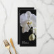 Customisez la jolie Orchidée blanche sur le menu Mariage noir avec les détails du repas que vous pourrez servir à votre dîner de réception de mariage ou déjeuner de douche nuptiale en ajoutant la salade ou le premier plat, entrée ou deuxième plat et dessert ou troisième plat. Personnalisez-le avec le nom de la mariée et du marié, le lieu de réception et la date de la cérémonie de mariage. N'hésitez pas à modifier le texte ou la police en fonction de vos besoins nuptiaux. Ce menu personnalisé élégant présente une photo florale d'une fleur d'orchidée phalaenopsis blanche fleurie sur la tige avec un arrière - plan noir. Parfait pour le couple qui projette un élégant thème mariage d'orchidées tropicales.