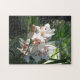 Ce puzzle montre une photographie de belles orchidées du printemps fleurissant dans une forêt verte.