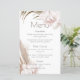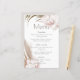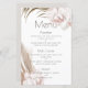 Ce menu mariage est élégant et romantique et présente une aquarelle tropicale boho fleurie. De beaux bouquets de fleurs d'orchidées de couleur rousse, d'herbe de pampas et de feuilles de palmiers sont représentés en haut à gauche et en bas à droite.