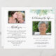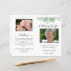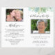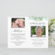 Programme de funérailles de goût avec la photo de votre proche décédé, mis en valeur par un beau détail de verdure à l'aquarelle dans des tons turquoise pâle, bleu et vert. Sur la couverture, sous la photo du défunt, vous pouvez ajouter leur nom, date de naissance et de décès, adresse du lieu de la cérémonie et date. À l'intérieur, à gauche, il y a un espace pour la nécrologie et à droite un espace pour l'ordre du service. Au dos, il y a la possibilité d'ajouter une deuxième photo, un message de remerciement et des directions pour après la cérémonie. REMARQUE : le programme est fourni en feuille de papier de qualité plate qui devra être pliée une fois que vous la recevrez. Carte d'invitation à la Célébration de la Vie, livre d'or, panneau de bienvenue avec photo et notes de remerciement coordonnés également disponibles. F