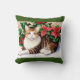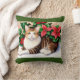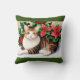 Un carré lance un oreiller avec une bordure verte présente une peinture aquarelle d'un chat tabby devant des poinsettias et des saints. Le chat a des rayures brune et brune, un coffre blanc et des yeux jaunes. Il est allongé sur une surface blanche, et l'arrière - plan est rempli de poinsettias rouges et de feuilles verts saints. La peinture a un effet doux et aquarelle, avec un ombrage doux et un mélange de couleurs.
