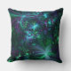 Coussin de motifs floraux abstraits vert, bleu et violet.