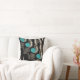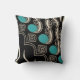 Jetez l'oreiller avec l'image de batik noir et turquoise à l'avant et un motif noir à l'arrière contre un arrière - plan turquoise.