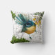 Un coussin avec un oiseau indigène de Nouvelle-Zélande, le Fantail, dessus ainsi que des plantes et des fleurs indigènes.