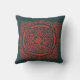 Oreiller jeté avec illustration graphique d'ornement rouge sur fond vert foncé.