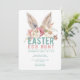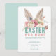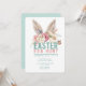 Cette invitation amusante à la chasse aux œufs de Pâques présente des oreilles de lapin aquarellées au-dessus des mots "Chasse aux œufs de Pâques". Tous les détails de l'invitation sont directement en dessous sur un fond blanc brillant. Le verso est d'une couleur bleu aqua coordonnée.