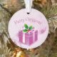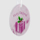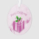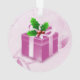 Ajoutez une touche de fantaisie à votre sapin de Noël avec un cadeau de Noël rose. Le design ornemental présente un cadeau de Noël rose vif orné de baies sèches et de flocons de neige tombant contre un élégant parchemin et arrière - plan feuille. Autres cadeaux et objets de vacances disponibles avec ce design aussi.