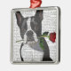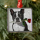 Ornement Carré Argenté Boston Terrier avec Rose dans la bouche