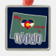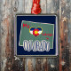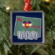 Toute personne qui aime ou qui désire la beauté de l'état du Colorado va adorer cet ornement ! La forme de l'état est en vert et bordée d'une bordure blanche. Sur l'image de l'état est un coeur de drapeau de l'état du Colorado doré, avec le en rouge et bleu qui dit "Mon (coeur) appartient à COLORADO". L'image est placée sur un arrière - plan bleu vif.