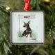 This Miniature Pinscher personalized ornament features a watercolor design with a customizable name flag, framed in elegant silver with a red ribbon. A spirited keepsake for Mini Pin lovers.