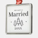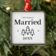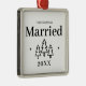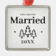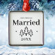 Premier Noël marié de luxe style ornement de métal haut de gamme. Elégante retraite de vacances gardée en blanc avec lettrage noir, arbres et étoiles pour un couple nouvellement marié après le mariage.