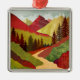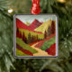 Un paysage abstrait avec des textures uniques montrant un paysage de montagne avec un sentier et des arbres randonnées et de beaux rayons de soleil dans les tons rouge, pourpre, jaune et vert.