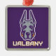Le logo de la mascotte de l'Université d'Albany Great Dane présente une représentation stylisée de la tête d'un grand Danois. Le chien est illustré de lignes vives et audacieuses en violet et gris, lui donnant une expression féroce et confiante. Les oreilles sont hautes, symbolisant la vigilance et la force. Sous la tête du Grand Danois se trouve le mot "UAlbany" écrit en caractères d'or gras et bloquants, surligné de violet, renforçant l'image de marque de l'université. Cette conception représente les équipes sportives d'UAlbany, mettant en avant le pouvoir, la loyauté et la détermination.