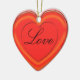 L'avant de l'ornement en forme de coeur montre un coeur rouge "gelé" (brillant et tridimensionnel) avec un coeur en fil rouge au centre. Au centre du coeur plus petit se trouve le mot "Amour" dans le script. À l'envers, personnalisez avec des noms en script noir, sur le coeur "gelé".