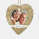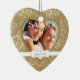 Votre photographie est enfermée dans un cadre ancien en bronze coeur motif, avec une bannière blanche en bas qui tient votre date spéciale sur cet élégant ornement de conservation. Le fond de l'ornement a votre texte customisé sur un champ en forme de coeur clair et encadré du même motif de coeur en bronze. Cela fait un Noël merveilleux, premier anniversaire ou la Saint Valentin gardienne pour n'importe quel couple.