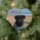 Photographie originale d'un chiot noir de carlin sur la plage avec le sable sur son nez sur un ornement de coeur.